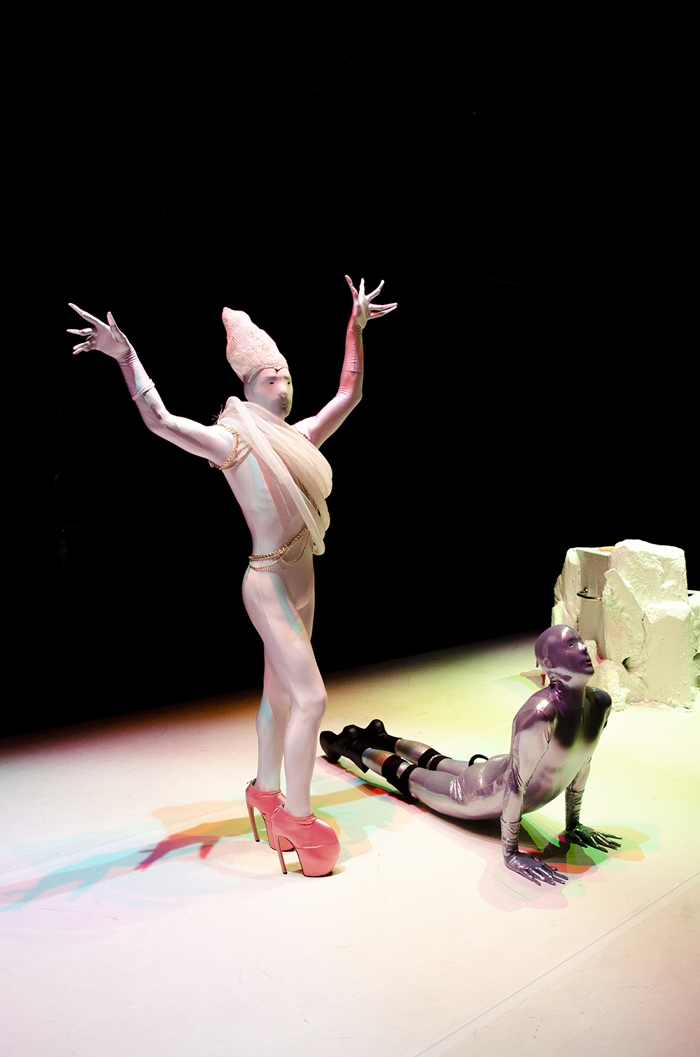 A choreographic piece for two people, CLSTRS draws its inspiration from various entertainment traditions – such as cabaret, burlesque and the musical revue – which render visible the social construction of bodies and genders. Moved by a tension between the present and an indeterminate future, it opens onto a new horizon of utopia, offering an infinite range of possibilities represented by hybrid and ever-changing bodies, as the result of a cluster between the masculine, feminine, biological and technological poles. What could a human ideal represent in an indeterminate future? What will this corporeal envelope be made of in the future?- Arsenic, Lausanne