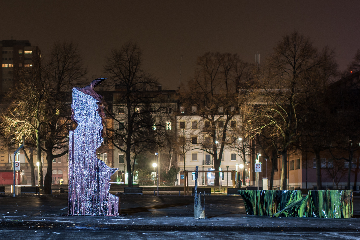 Christopher and Michel also work together at an outside of Kaserne area. the Basler place merge in the daytime and nightlife and is in constant negotiation. In the frenzy of the night, the Kaserne area features a huge, poetic façade banner, a flag, a few sculptures, liquor and music - the tumbling monument.