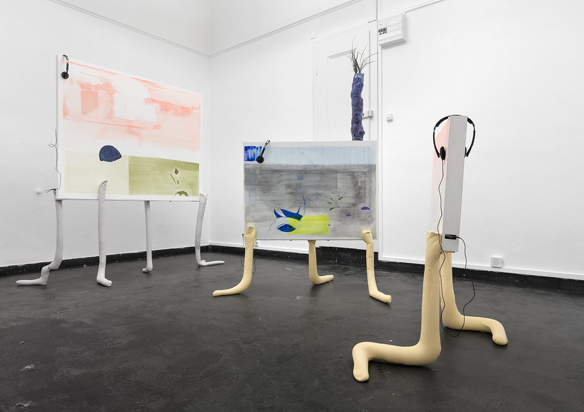 L’exposition «les émotions spatiales» est une exposition itinérante né de la collaboration entre les deux artistes Charlotte Herzig et Christopher Füllemann et de la curatrice Elise Lammer. Ensemble ils proposent un assemblage spatial composé de sculptures, peintures, performances ainsi qu’une animation-vidéo. Une bande sonore tirée d’un texte écrit pour l’occasion par Elise Lammer est intégrée dans chaque sculpture. Munis de pieds et d’écouteurs pour parler aux spectateurs les murs partagent des émotions. Né sous le désir de développer un language émotionnel et formel au travers de deux médiums réunis, «les émotions spatiales» est avant tout une expérience sensorielle. Moitié peinture, moitié sculpture les deux artistes décousent leur médiums respectif pour se retrouver sous une forme nouvelle, hybride. Des morceaux de murs peints détachés de l’architecture, se positionnent en autonomie sur pieds comme des peintures en mouvement dans l’espace. Par un assemblage spatial faisant penser à un collage tridimensionnel, chaque oeuvres communiquent et construisent des dialogues entre; elles, l’espace d’exposition et le spectateur. En effet, une fois le spectateur entré dans l’espace, il se retrouve intégré et ainsi une relation active débute entre les oeuvres et elle/lui. Munie d’une voix chaque peinture-sculpture est en conversation avec le spectateur, communiquant des idées, des envies, des craintes, confiant des histoires personnelles sur la rencontre et son intimité. Chaque oeuvres sa voix. L’envie de générer différentes relations, réflexions et mouvements possibles entre les œuvres et le visiteur se trouve encore une fois perceptible. Compositions poétiques et mutations variées, toutes les transformations appliquées aux médiums s’accumulent tels des gestes du quotidien mélangeant les modes de communication. Des éléments de céramique au sol, comme des volcans en éruption donnant naissance à des fleurs, ponctuent l’espace et accentuent la sensation de se perdre dans un ensemble. L’éphémère se fond dans la peinture et entre physiquement en contact avec les formes. Les fleurs bougent doucement et se fanent.