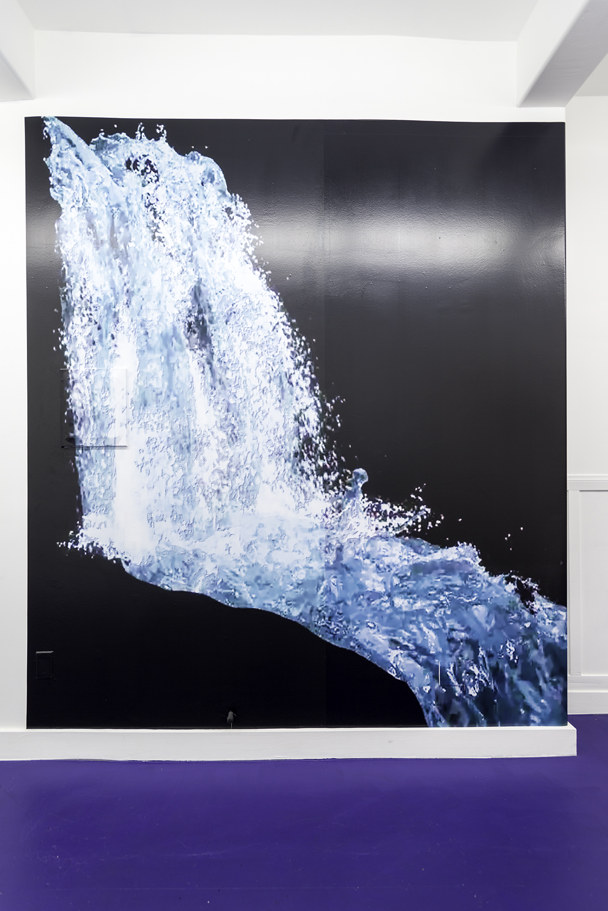 Füllemann and Keller, usually individually focused artists, have for this show devised a sculptural installation where each piece is wholly collaborative. The work will stand at the nexus of their two converging art practices, investigating material translatability through postdigital aesthetics. In a metamodern gesture, the artists painted the floor a deep blue-screen blue, positing it as a transparent frame for the ‘rematerialization’ of their own sculptures. (1) Constructed on impulses of viewership in a simulated world, the artists examine ‘digitization’ as a frame through which linguistic and visual information is passed, thus becoming a tool for cultural abstraction. In their material transgressions, an apparently natural object can be synthetic, or a positive sculpture can be suggested by negative space; sculptures bubble down, melting back into their original forms, in the process becoming new materials of which they were never made. A fence is constructed down the center of the space, applying a physical and visual restriction that emphasizes spatial agency as a perceptual device embedded in both gallery viewership and digital content. The total work recalls a photographic freezing of time within an abstracted landscape where objects are always in the process of becoming themselves - like the blurred, engorged waterfall image stretched over the West wall - an ongoing entelechy, ever reperforming their own shifting existences.