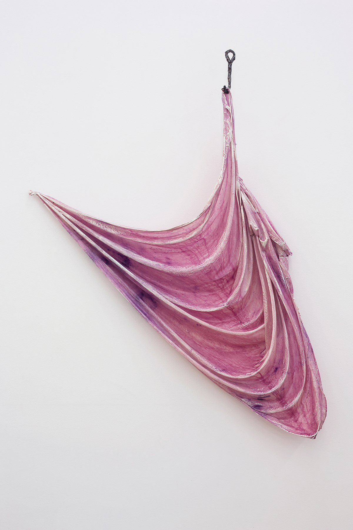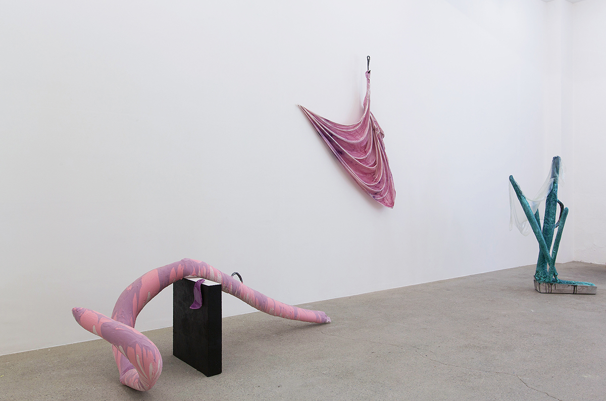 Lastly, in the third stage of the show, a stunning, eccentric sculpture stands erect. Like many of the artist’s creatures, this sculpture is shaped from the remains of a former sculpture, having first lived as a monumental chain of skin-like color stretched across a room of the Musée cantonal des Beaux-Arts, Lausanne, in 2013, then as an outdoor sculpture for the rest of the year. What was once horizontal now rises as a vertical body, covered by layers of new skin, hovering between elevation and collapse, between stillness and movement, between balance and fall, between sensual attraction and repulsion, between sculpture and flesh.
